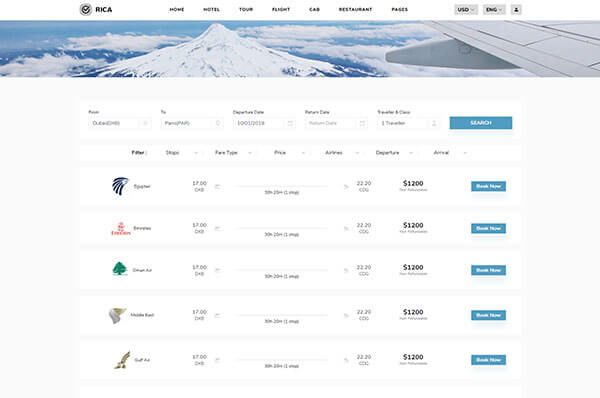 Rica has all the required pages of flight booking. there are 3 demos, 5 listing pages which also include round trip and 5 other pages.